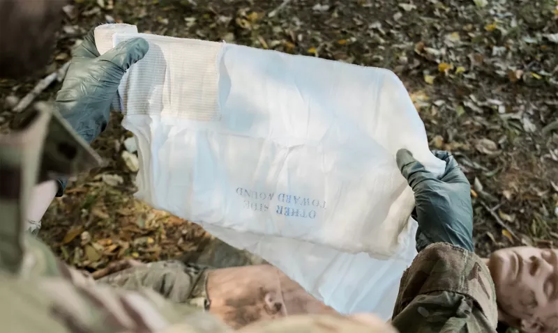 Traumaförbandet som täcker ett brett spektrum av skador. Förbandet har utformats för att snabbt kunna täcka traumatiska amputationer, brännskador och stora sår med minimal användning av förnödenheter och minimal ansträngning.