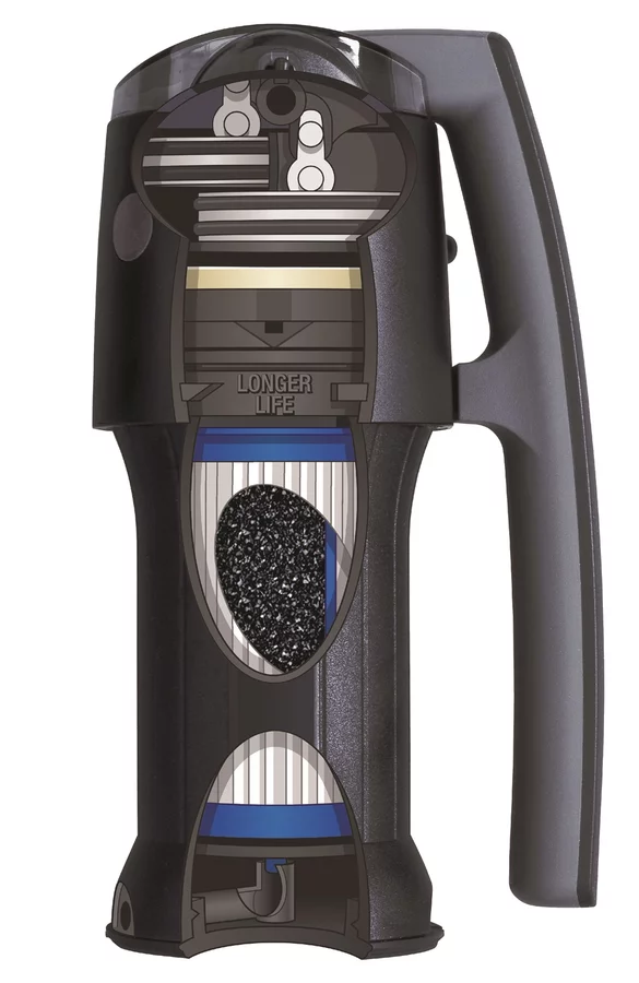 Ett hög effektivt glasfiber-filter. Ett keramik förfilter som kan ställas in individuellt beroende på grumligheten i vattnet, hjälper även till att förlänga livslängden på glasfiberfiltret. Ett aktivt-kol filter som eliminerar eventuella dålig lukt i vattnet.