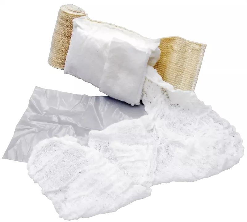 om elastiken skulle tappas. Du behöver inte längre öppna eller bära med dig gasbinda och bandage separat, eftersom båda ingår i samma förpackning.