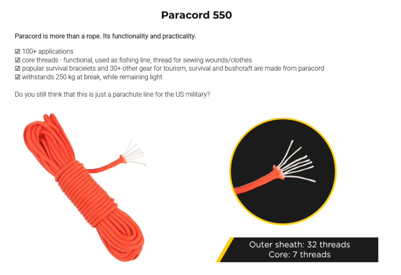 Paracord (Fallskärmslina) är mer än bara en lina, den är både funktionell och praktisk. Kärna med 7 stycken kärntrådar som kan användas som fiskelina, sy ihop sår och laga kläder med. Linan går utmärkt att göra exempelvis armband av. Ett måste för soldaten eller friluftsmänniskan i packningen. Du kan användas den till det mesta, exempelvis att bygga bivack, för fältreparationer, som tvättlina mm.