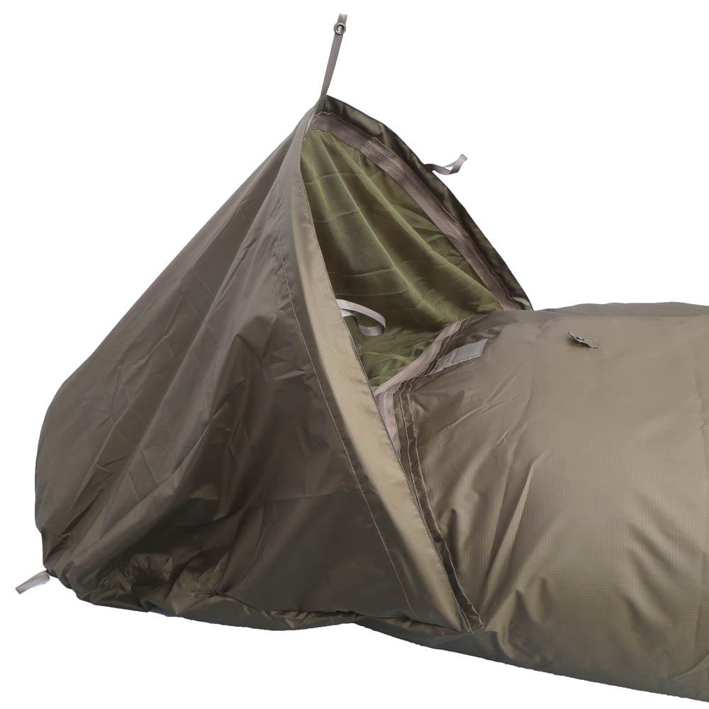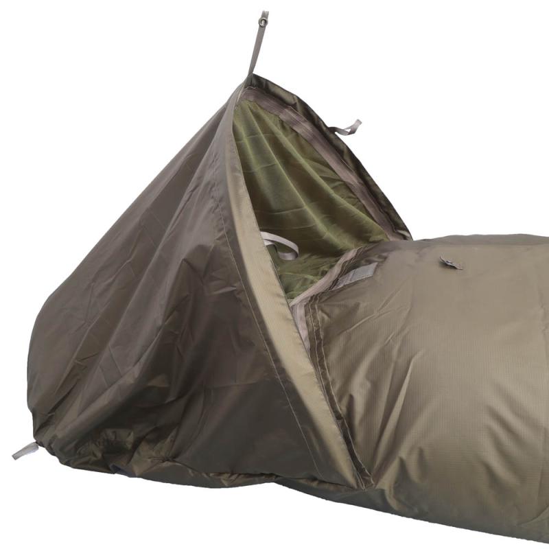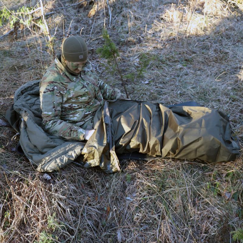 Ett lätt sovsäcksöverdrag med huva och dragkedja för din sovsäck som håller den torr och skyddad. Utformat för att säkerställa en bekväm nattsömn för soldater i alla väder och på alla platser i deras sovsäck. Avtagbart myggnät fäst med dragkedja.